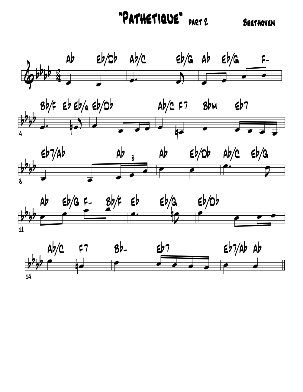 "Piano Sonata #8 / op. 13 / 2nd theme / Beethoven." We close this discussion of chord melody for guitar by including the lead sheet for a Beethoven sonata. Tis an ultimate 'puzzle' for those adventurous souls among us. Good luck. |