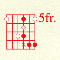 Chop shop second lick for rocker chords. These two chord shapes yield a ton of coolness. Rocker leaning artists should master these cold. Master these and the root note letter names on the low 6th and 5th strings. Derived from the open 'E' and 'A' chords, our index barre finger becomes a movable capo. These shapes are surely keepers. Example 5. |