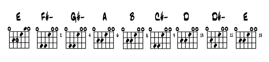 Walkup 'E' diatonic chord lick with open strings. Whomp the low open 'E' and run these shapes up the neck, and catch each of the diatonic seven chords along the way. Example 9. |