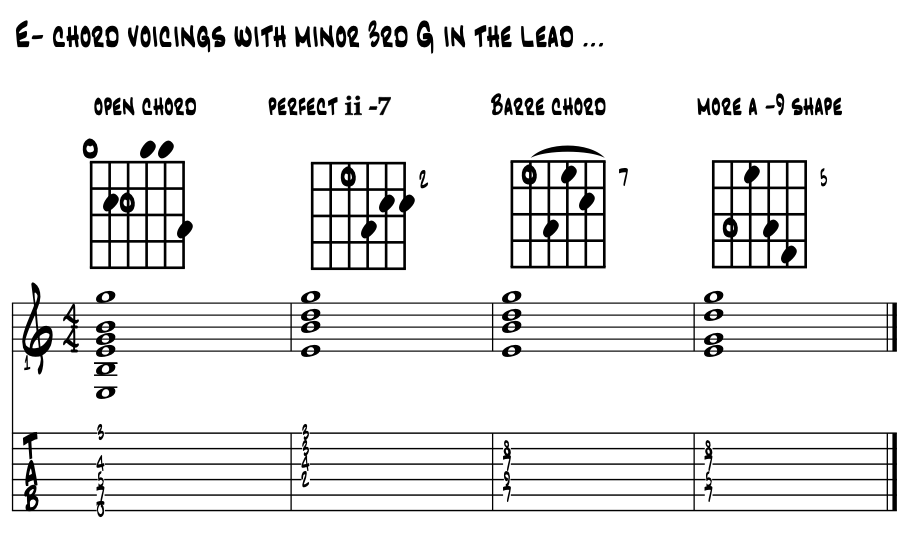 | Finding the chord for a melody note. So right out of the gate after the pickup note, our lead sheet tells us we need an 'E' minor chord with a 'G' note on top. OK. 'G' is the minor 3rd of an 'E' minor triad. So all we need to find is a chord shape with a 'G' note in the lead, the top note of the chord voicing. Here's a few 'E' minor chords with a 'G' in the lead. Example 1a. |