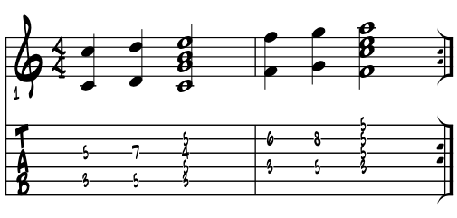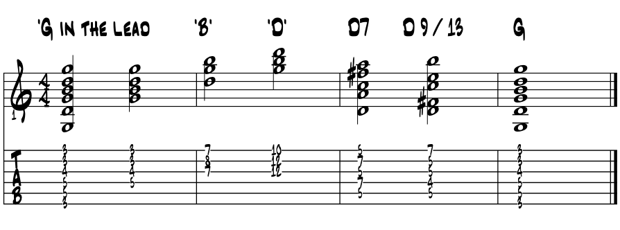 | Melody and chords. In our melody we've the notes 'G, B, C and D' starting out with a 'G' major chord then the pitch 'A' and 'B' in measure 7 that calls for a D7. In starting, we're just looking for various 'G' chord voicings that have these tonic triad notes as their top pitch. This first chord shape is fairly common, followed by a few more triads moving up the neck. Example 2a. |