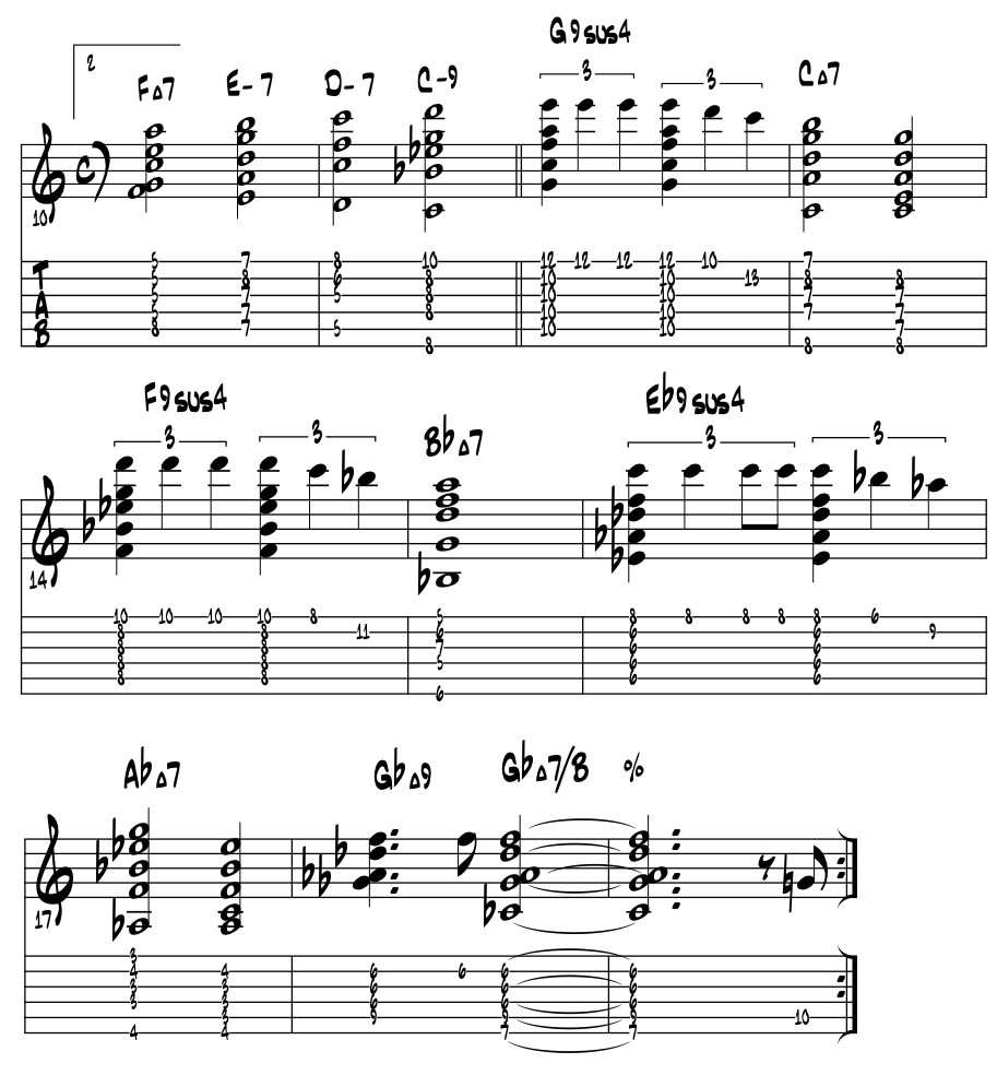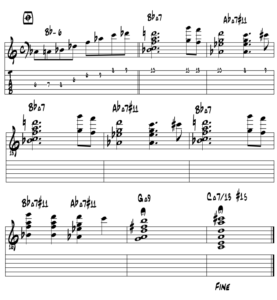 | Author's note. Of all the jazz guitar techniques and ways to puzzle the pieces together, this 'peppering in' of the changes into melody lines was the most challenging. Once conquered, its become a mainstay of my palette and just a superhoot to conjure in performance. |