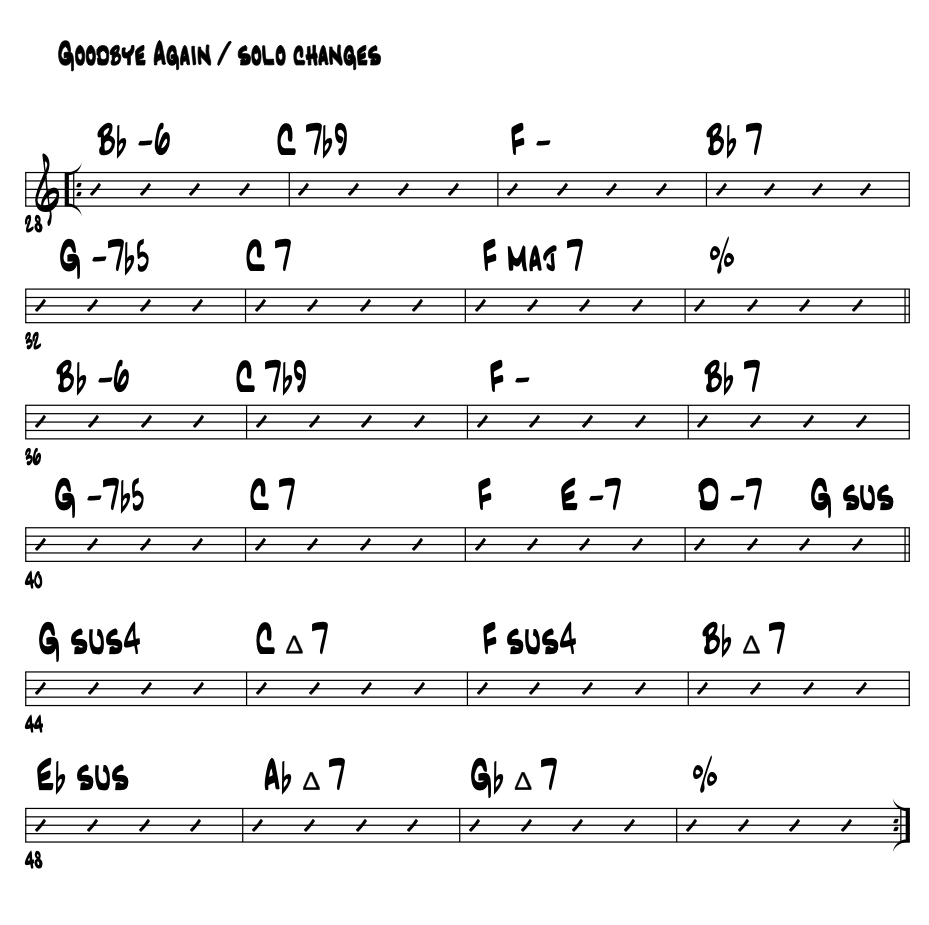 | For just like our choirs of old and today, our chosen chords will have a bass, tenor, alto and soprano note, (with jazz chords this becomes a root, 3rd, 5th and 7th) just like the sections of a choir; melody note as the top pitch of a chord, bass, tenor and alto notes below. Please examine the following lead sheet style chart. |