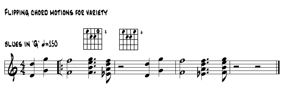 | Very repetitive? Too much? A brighter tempo brings ideas, such as changing the direction of the 'G' 7 chord pairings. Change the direction of the two main chords. Like this. Example 5a. |