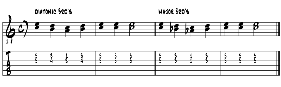 | Tonic evolutions. An easy way to add some color to any tonic One chord is to use the 6th /13th colortone and even some quartile harmony on the One chords. We can 'blue 7th' the voicing with 'B' in the lead too. Ex. 2b. |