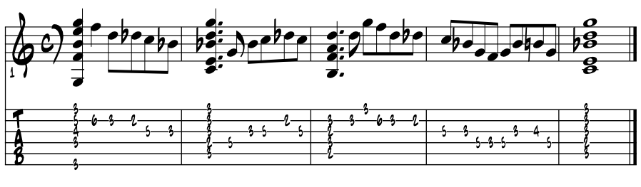 | Creating chord melody can sort of go like this. Thinking in the key of 'A' minor, our first chord symbol, 'A-', supports the melody note 'A', so we need an 'A-' chord shape with the pitch 'A' in the lead, so it's highest note, so on the high 'E' string. Second measure; a 'C' chord with the melody note 'C' in the lead; its top note. Third measure; 'D' chord,'D' note on top, in the lead then a 'C' note. Two options now; find a new chord shape with a 'C' on top, or by moving some fingers around, and find a 'C' note in the first 'D' chord voicing. In the fourth measure we need and 'F' chord, with its major '3rd' in the lead. |