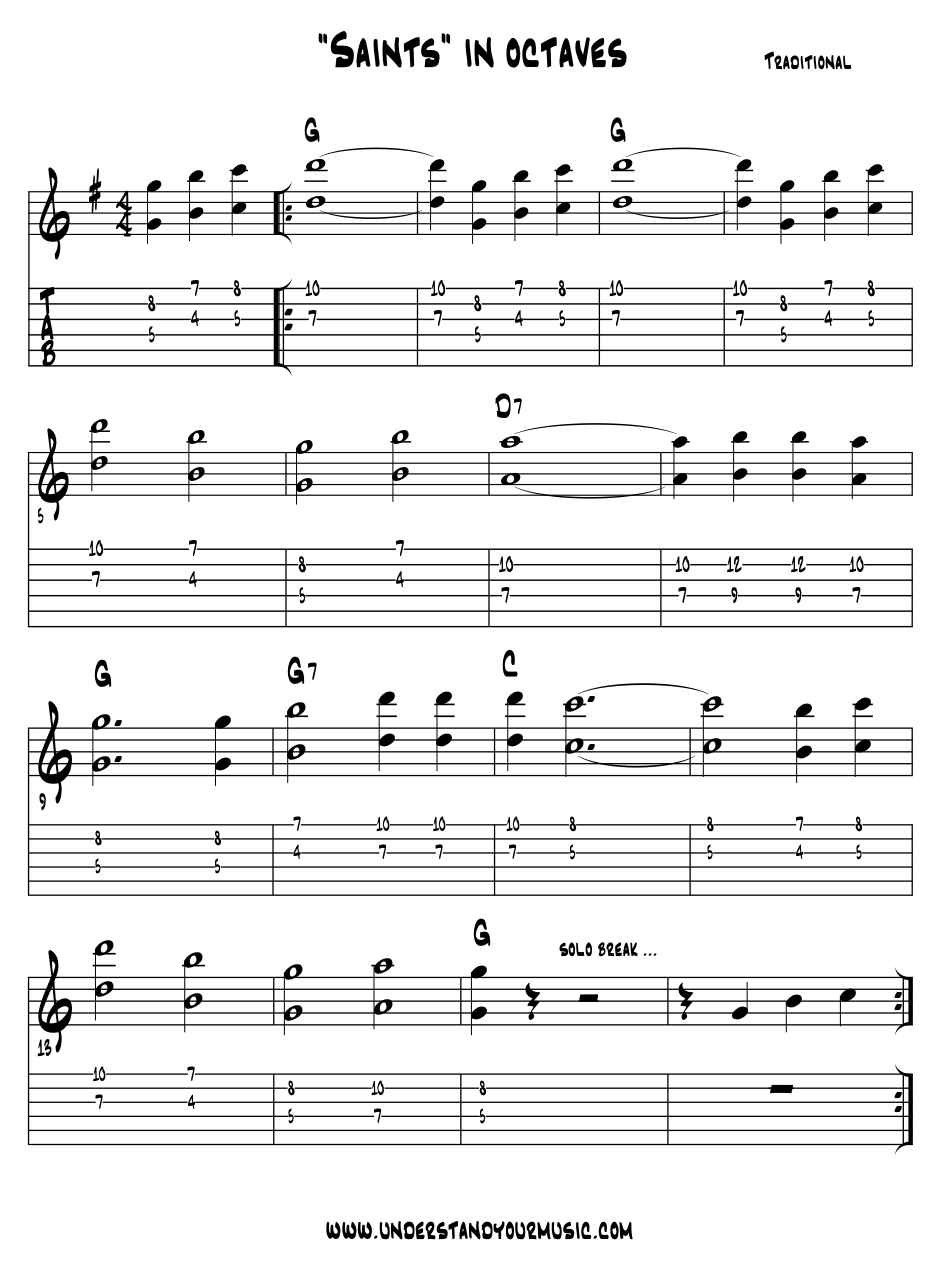 | Got this up and running? Start slow for sure and work it up to your tempo. A cool thing about well crafted tunes is that they can often 'work' at most any tempo. That's determined by the combined skill level of the players in the band. The Ellington / Strayhorn classic "Satin Doll" fits right into this style of octaves and chords. And for "The Saints?" Still makes for a memorable great break tune in the right room ... :) |