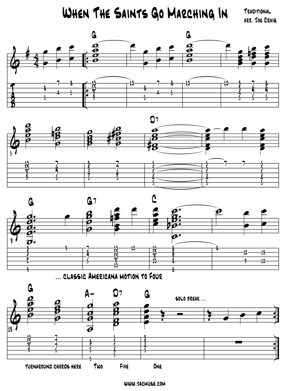 | "The Saints" ... and away we go.' With the 'by leadsheet / by ear' ways just described, let's build up chord melody of an Americana fave using both. Know mostly by heart for some readers here, so already rote memorized :) Working from Mr. Louis Armstrong's recording of this song from back in 1938 recording, we work in the key center of 'G.' Coolness prevails yet again as the stars align decades later, as this ties us right into the key center for exploring and getting the five core scale shapes of our jazz guitar method under our fingers. |