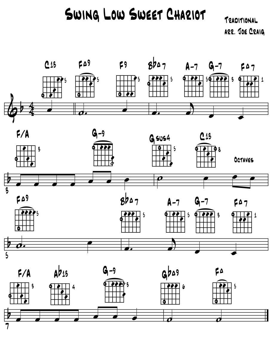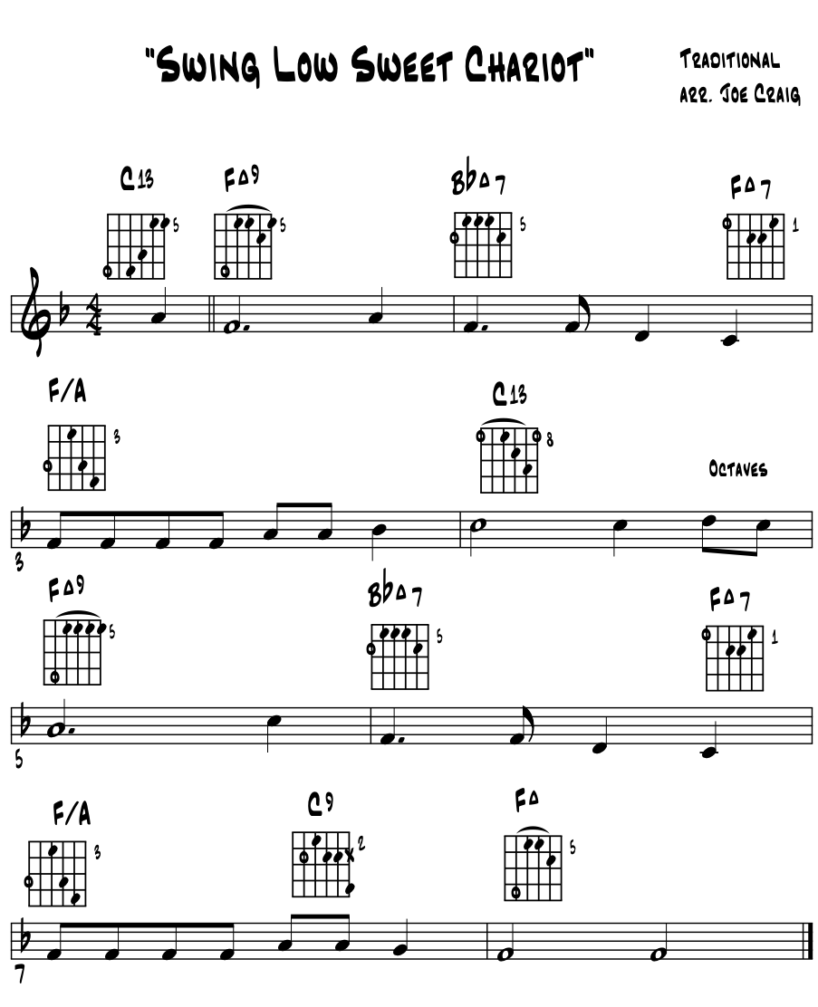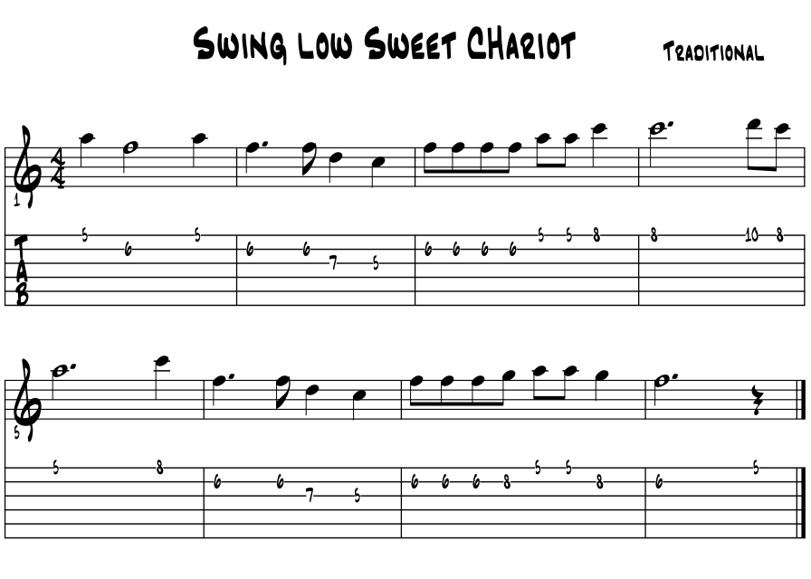 | A melody to start with. We build up this next chord melody for "Swing Low Sweet Chariot", a core song of our Americana gospel tradition. Six pitches in the line, basic diatonic motion and super clear direction and message make it a keeper. We start off by learning its melody pitches of the melody. In 'F', classic, earthy gospel key center. Example 3. |