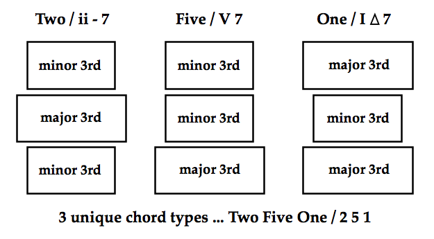 | A cadential motion of chord types. We next can place these three 'types' of chords into a resolving cadential motion. While the 'One / Four / Five / One' is the most common, in jazz, oftentimes Two subs for Four, as motion to Four becomes more of a destination in telling a song's story. The Two and Four chords are also just one pitch apart in the arpeggio. Example 3. C E G B D F A C E G ... The Two chord is sleeker for the brighter tempos of jazz. This translates into a rapid ability to modulate from one key to another. It is also closer to One by proximity of their root pitches. We'll end up filling in this space using a chromatic motion with the 'great accelerator.' We get variety, with the three different sounding chords in the Two / Five / One cadential motion. And Two / Five as an independent non resolving 'cell' is just jazzier to work with. So we get to imply a direction in the music, then quickly go there by resolution to One, or not, as the case may be. And like Four / Five, the Two / Five is a common vamp. Cycles of Two / Five's are common and fun, and evolve into the '3 / 6 / 2 / 5' motion of many hipsters. So there's lots of cool reasons to think by chord type and sub the Two (ii -7) for Four (IV maj 7). Here's Two / Five / One in 'C' major. Example 3a. |