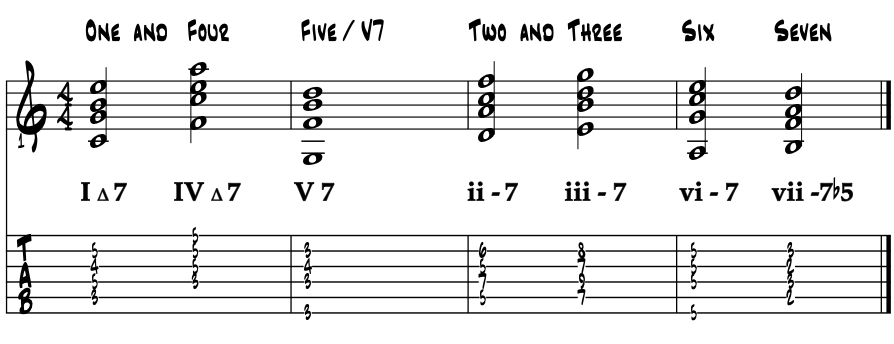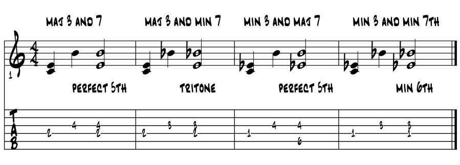 | The two combinations of 3 and 7, that create the perfect 5th interval become our One type chord in a major key. The two pitch, 3 and 7 tritone, is the unique tension within V7, so it directs the harmonic flow of the music. |