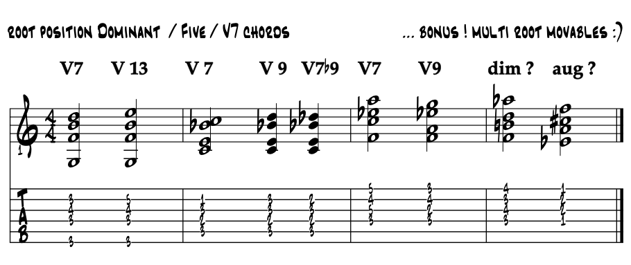 | Cool? The '13' chord is a fave. A perfect 4 finger / 4 fret shape for the start and stop, pop to swing da rhythms :) The 'V9' chord 'the' funk voicing. Know the '#9' right nearby? In the bonus ! Well, and going off the playground a bit too. For the 'dim = diminished' and 'aug = augmented.' These are symmetrical shapes with neat ways they can 'legally' move about. |
