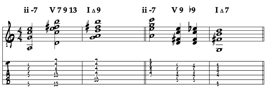 | The Five and One chord voicings in this next idea are new. Thinking 'G' major. Example 5. |