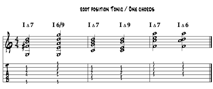 | All initiated by the root pitch of any chord, once the pitch letter names are mastered on the lower two bass note strings, a handful of movable voicing / shapes provides a way into even the most intricate of harmony weaves and chord substitutions. |