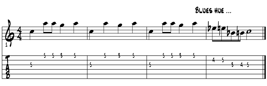 | Hear the blues hue. The blues hue is that bit of Americana coolness we often hear in songs that sound near purely diatonic and add in a bit of the blue to sweeten the mix. Here's a melody from wayback with a bit of the blues hue at the close of the idea. Example 6. |