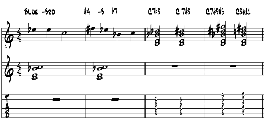 | Hear the dissonance of the non diatonic notes? Cool ... or just click it again. Some of the notes just sound out of tune? Yea, that's all it is. Like the melody pitches of the last two measures? Jazzers call these pitches as being 'outside' of the diatonic realm. Yet, in another musical context, these become essential pitches to rub up to the diatonic ones to create the blues hue. Can these other five pitches become the blue notes ? And further, the altered colortones of our chords? Well yes to both ! |