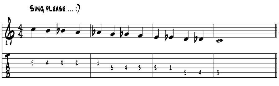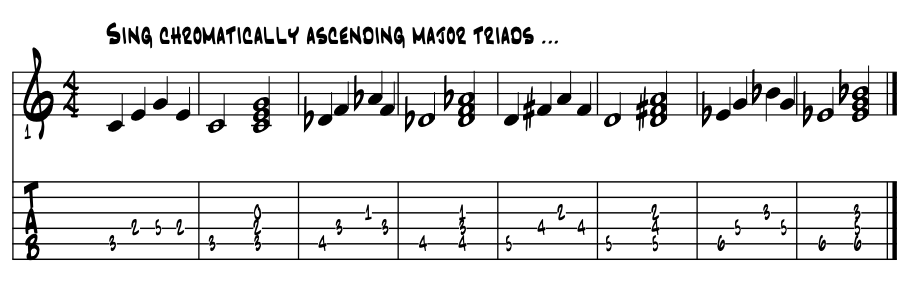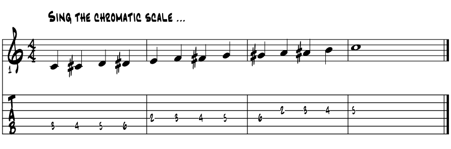 | Sing a chromatic scale. Ever sing all 12 of our pitches in a scale? No ? Right on another first ! Click and sing along with the music. Example 2. |
