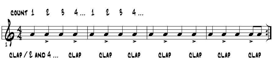| Find 2 and 4. Once we're sure of which way the pitches are going, up or down, we want to know how they get set into motion in time. And specifically with our Americana, finding the accented beats on the 2 and 4 of basic 4/4 time. Count to four and find 2 and 4 :) Please count aloud 1 2 3 4 and clap your hands on 2 and 4, giving the claps on 2 and 4 beats a bit more. Ex. 1a. |
