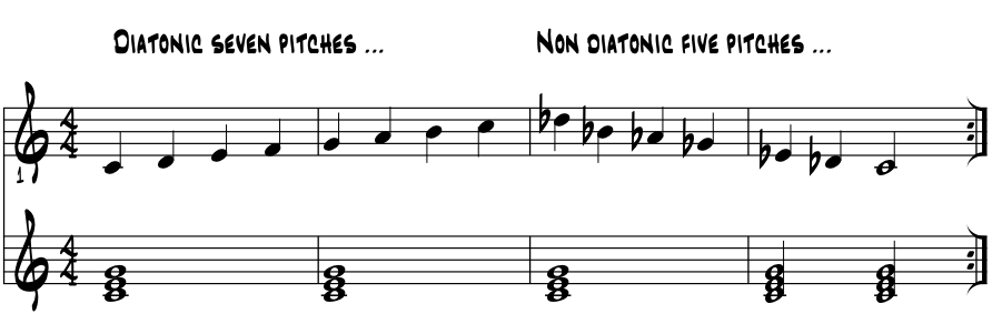 | Diatonic / non-diatonic. A true key to understanding the theories of Americana is often termed in this work as the 'blues rub.' In creating these 'rubs' of sound, we're simply choosing to rub selected pitches together that wouldn't 'normally' do so. Some pitch rubs make the blue colors. Theory thought and lingo wants to describe these rubbed notes as diatonic, so a pitch within a chosen key center. Or non diatonic, so a pitch not within a key. Since there's only 12 pitches, and we use mostly use 7 to create a key, we're left with 5 to sort out as non diatonic. Thinking 'C' major, please compare these pitches. Example 5. |