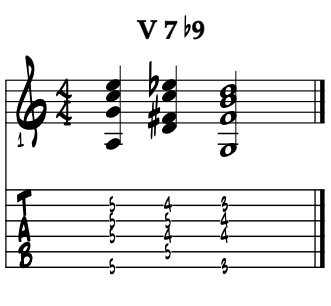 | In this next idea we add a 'minor 3rd blue note' to make a true V7 chord, and then add the non-diatonic pitches to create some of the common blues and jazzy chords we love. Example 5a. |