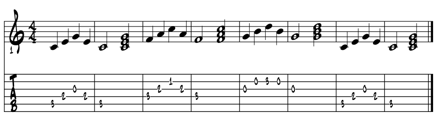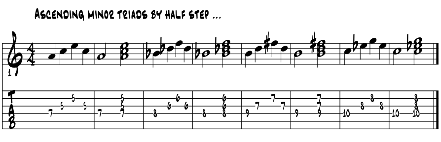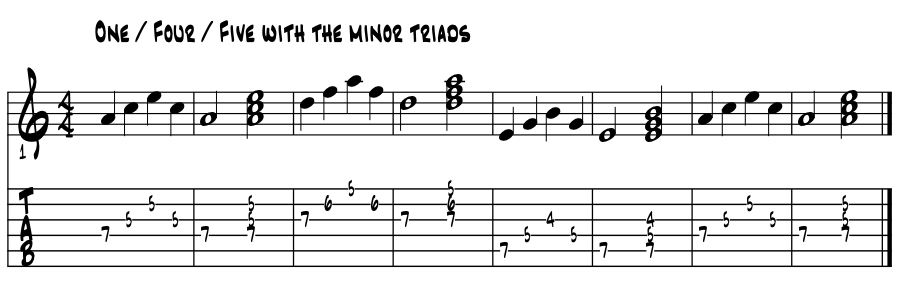 | Minor triads. Here's the same '1 3 5' idea as above but with minor triads, outlining the diatonic One, Four and Five triads of a minor key / tonal center. Thinking 'A' minor. Example 4b. |