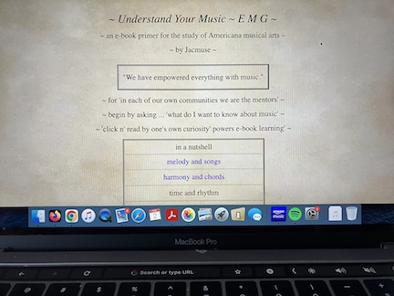 About this e-book. This is my opus in taking up that challenge; that by powering up a laptop and opening this musical arts e-book, the magics of many learning styles; to play with and sift ideas to imagine new combinations, work through rote styled learning challenges to success, print and complete written measures of vocabulary and concepts, spark curiosity and pursue 'what if' questions, and to learn about music and its most complex theories by ear, these all become possible in an e-book web page format, energized by the curiosity a learner brings, with their existing knowledge sparking off a lifetime of discovery learning in the musical arts. Spanning the basics; from first spelling out pitches of scales, triads and chord progressions of J.S. Bach, on through to the complexities of Americana improvisation through J. Coltrane's post bop symmetry and phrasing into the future through the principles of forward motion moving through musical time. Mentor ~ student dialogue. Yet written always with the learner in mind, a dialogue between mentor and student, with one's own self expression of art through composition and collaboration. All of these discussions are organically hyperlinked, woven together by their various commonalities. There's 28,000 and counting ... internal links in this fully formed, stand alone e-book. That an e-book can also be on the 'global' www platform, which this e-book is, exponentially expands our classroom learning dimensions of discovery, the fellow learners and new friends who share our own interests in art and music, and that learners will become the teachers to new learners as the successive generations pass. Thus, an "E-book on pad / laptop", individualized mentor guided learning with potential global resource additions. |