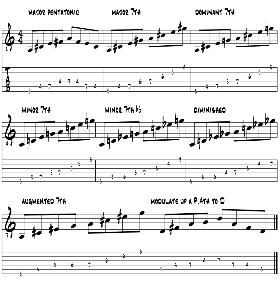 | Transpose to all 12 keys by moving root notes up and down the string. Here's some common shapes from our chosen root pitch 'D', now 5th fret / 5th string. Ex. 4a. |