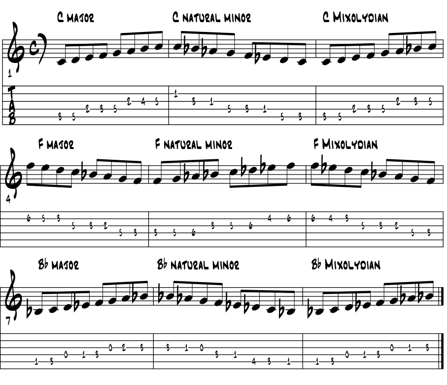 | So from our chosen root pitch 'C' this shedding cycle covers the major, natural minor scale and Mixolydian. As Mixolydian is our V7 / C7, its aural color sets up the modulation to our next key center 'F', where the process starts over again; major / minor / Mixolydian / F7, then off to 'Bb.' Cool ? Run this through all 12 keys? Absolutely. Anything from anywhere right? For while these are just three of our many essentials colors that we get in all 12 keys, they also are the parent scales for Two / Five and One chord types, and form the essential cadential motion of jazz. |