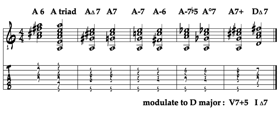 | So with the arpeggios so with chords. Following along our above format, examine the various chord colors from the root pitch 'A', so the 6th string / 5th fret. Example 5a. |