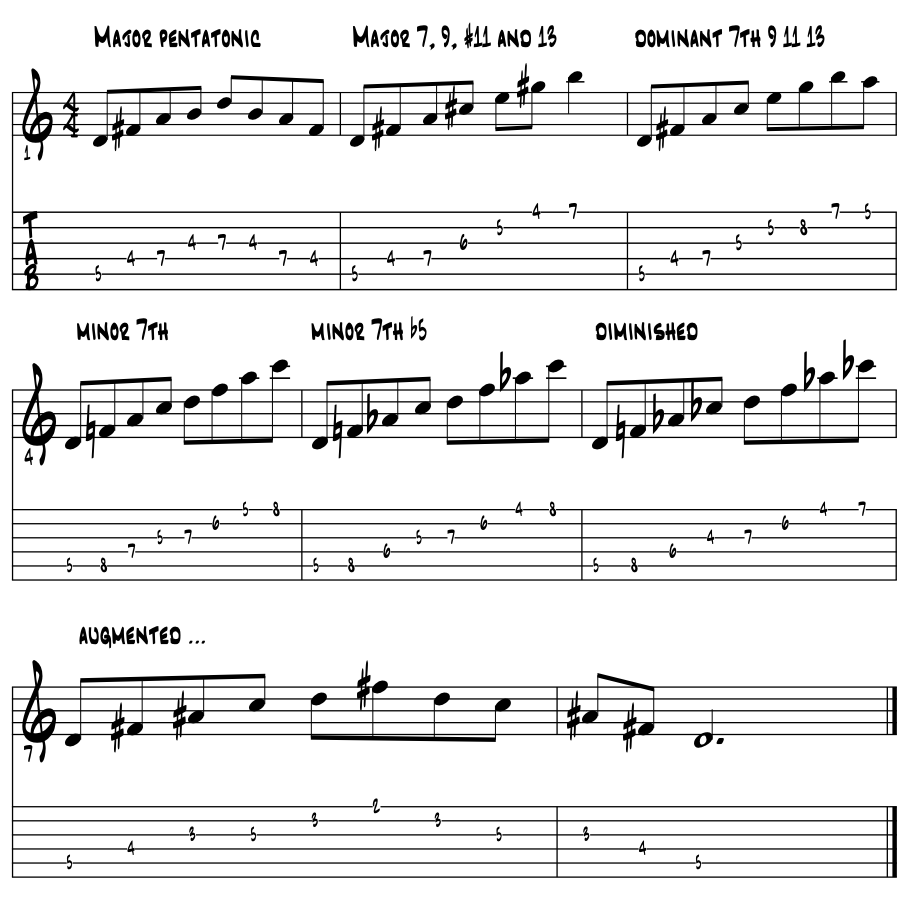 | D dominant 7th and beyond | 1  3 5 b7 9 #11 13 | D F# A C E G# B |