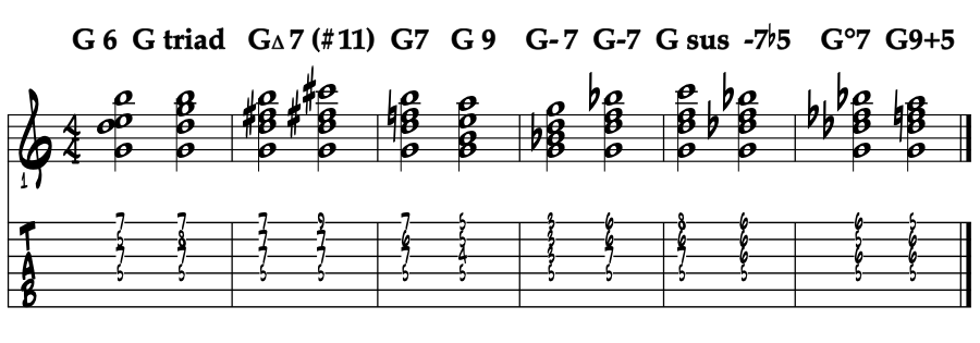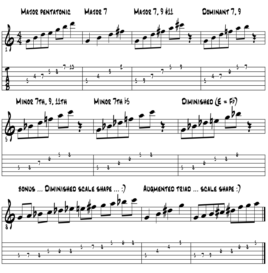 | Transpose to all 12 keys by moving root notes up and down the string. Here's some common shapes from our chosen root pitch 'G', now 5th fret / 4th string. Ex. 4b. |