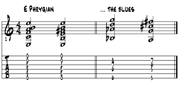 | E blues | 8 b7 5 b5 4 b3 1 | minor pentatonic w/ tritone upgrade |