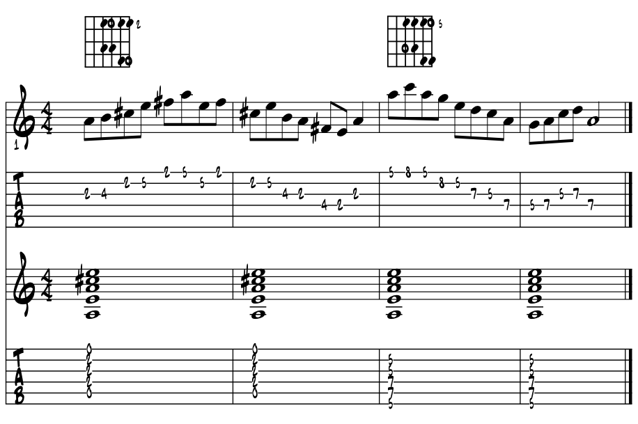 | chord pitches | A | B | C | C# | D | . | E | F# | G | G# | A |