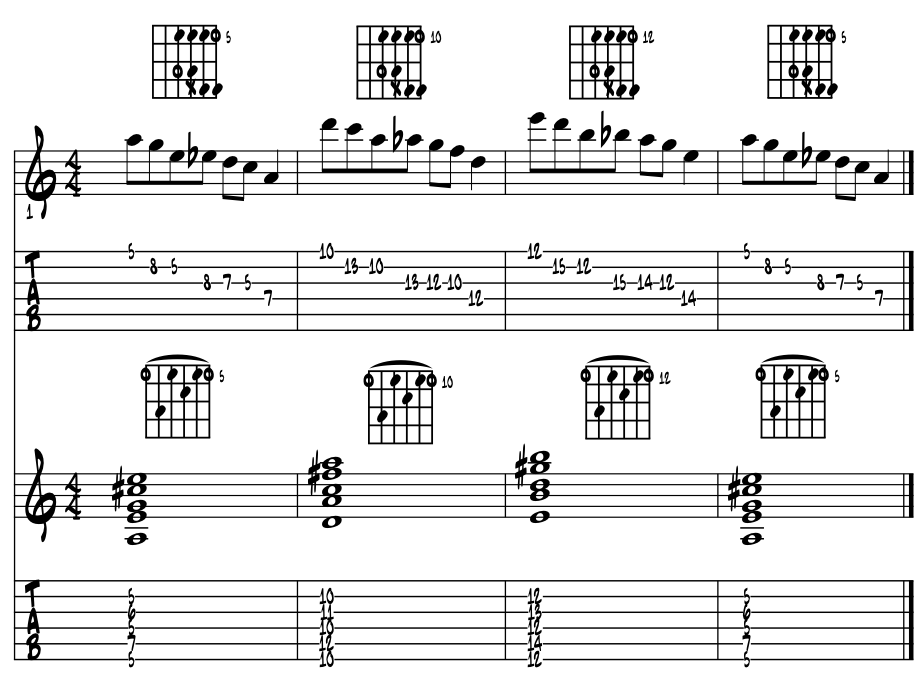 | In this whole fantastic blues library of over the changes musical art, the consistent 'blues rub' theory goes mostly like this. Thinking 'blues in A', examine the pitches of the scale and chords followed by a realization of the pitches. Example 2. |