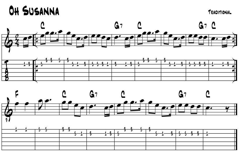 | A 'six pitcher' that went #1, written back in 1849. Another true Americana classic, "Oh Susanna" is one we all sang at some point along the way. Big radio hit for many stars over the last century, once we get these sorts of melodies totally rote and under the fingers, our interpretative universe will blossom evermore. |
