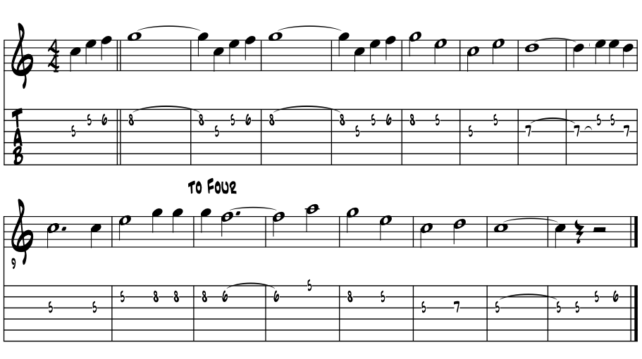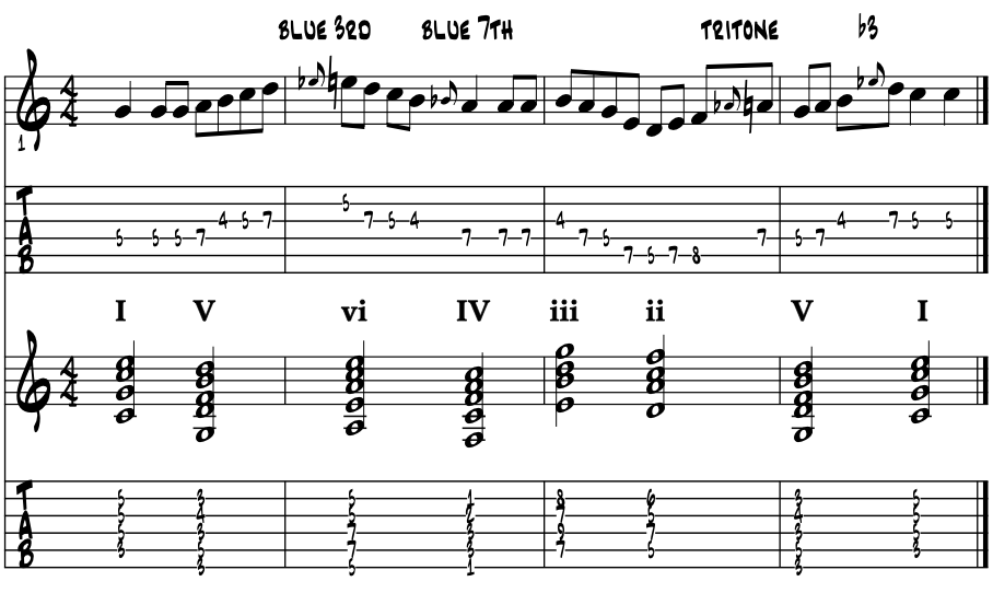 | See how the Roman numerals evolved? We're now measuring everything from the pitch C, One, which is the root or tonic of our key center in these examples. So probably starting to sound a bit on the 'classical' side of things? No real surprise there as the classical cats totally dig the diatonic and of course there's no real blues in the classical way of the theory. Here's some added 'blues hue' grace notes over the same changes. Example 4c. |