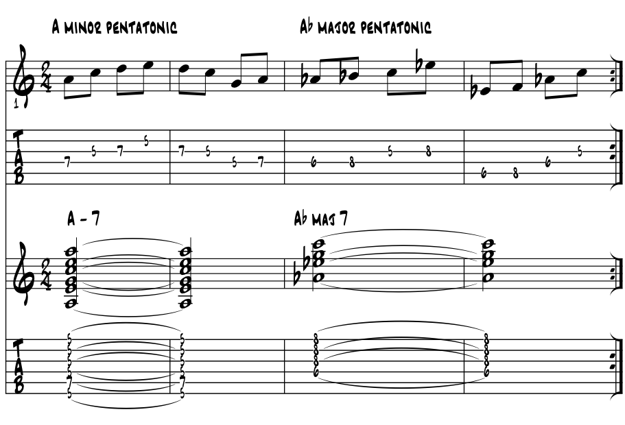 | Five pitches over different chords. That our five note pentatonic group know's no clunker pitches, it's the perfect group for creating ideas over loops of different chords. Here's a two chord jam vamp using the major / minor pentatonics. Think 'A minor to Ab' major. Ex. 1b. |
