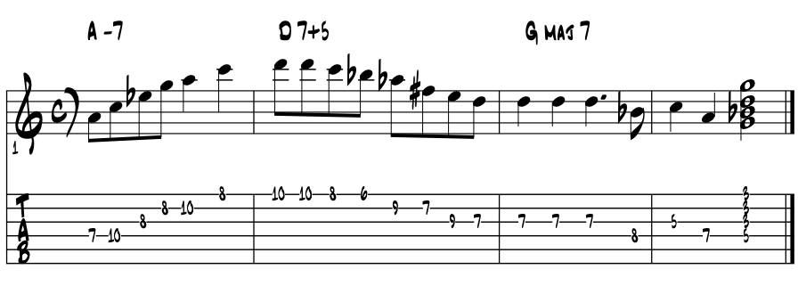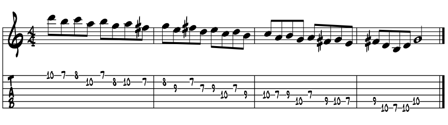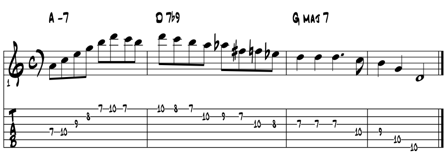 | In this next idea we use the easy Two chord DNA of this scale shape to create a jazzy sorts of improv melody line and resolve to G major. So, thinking Two / Five / One in 'G', or A-7 / D7b9 / G major 7 and ending up back around shape #1. Example 7a. |