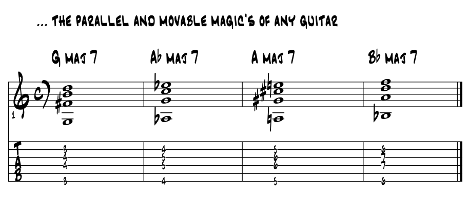 | Everything is movable ... in it's own way.' While the above shapes look notey, and they are, as we look to exhaust whatever might be in 'G' in each nook and cranny, know that they are completely movable. Up and down, to cover the other 11 key centers. So there's only these five to master, and while still a handful, it's only a handful. Likewise, every lick, scale, arpeggio and chord we shake loose from each of the these shapes is also movable up and down sometimes even across the strings. This 'everything is movable' is the great facilitator of learning jazz guitar and it'll apply to everything we learn. Everything? Well yes, at least till all this is mastered. The components of jazz songs often move around a lot; moving key centers, chords, arpeggios, borrowing pitches. So even just having five shapes covers a ton of ground when working through the literature. For example, this 'G' major 7th chord works fine in songs in 'G' major. It also feeds the bulldog for songs in 'Ab', 'A', 'Bb' and beyond. Example 2. |