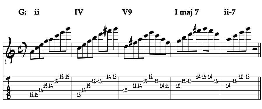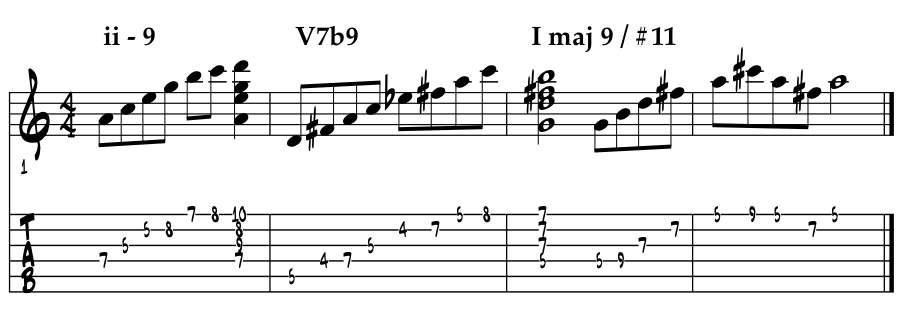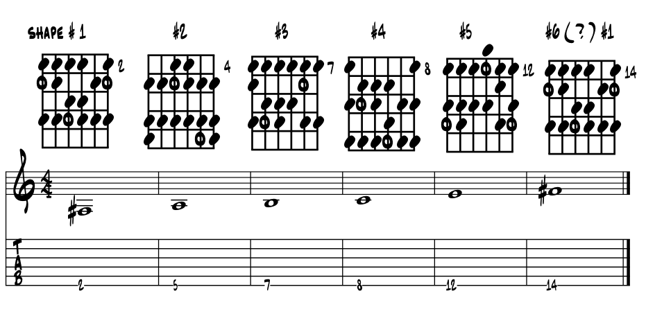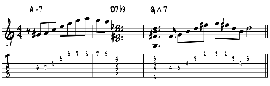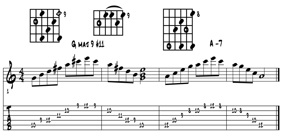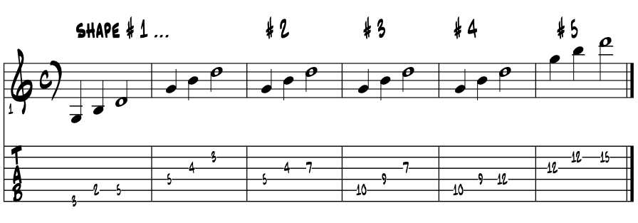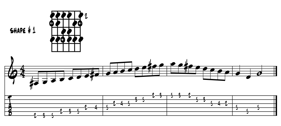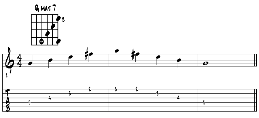 | Starting off on the leading tone F# and simply finding all of the pitches of G major in this one localized position. The closing Five (D) / One (G) in the written lick is ancient and as solid a way to close a line we get. Here's the major 7th arpeggio shape, a One chord type, from which this shape is named. Example 6a. |