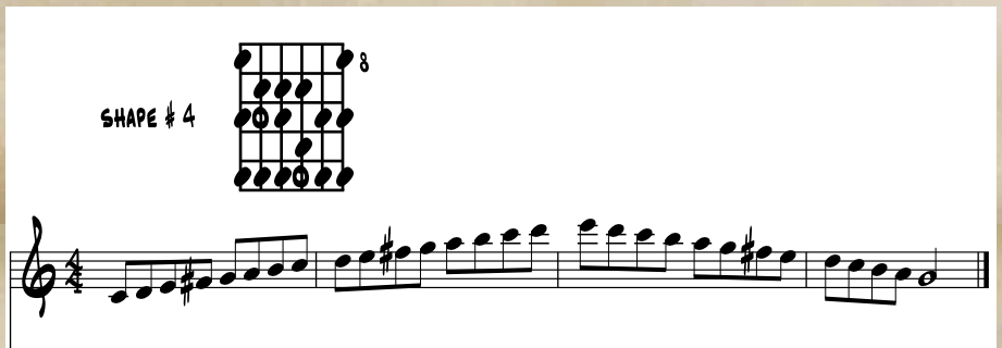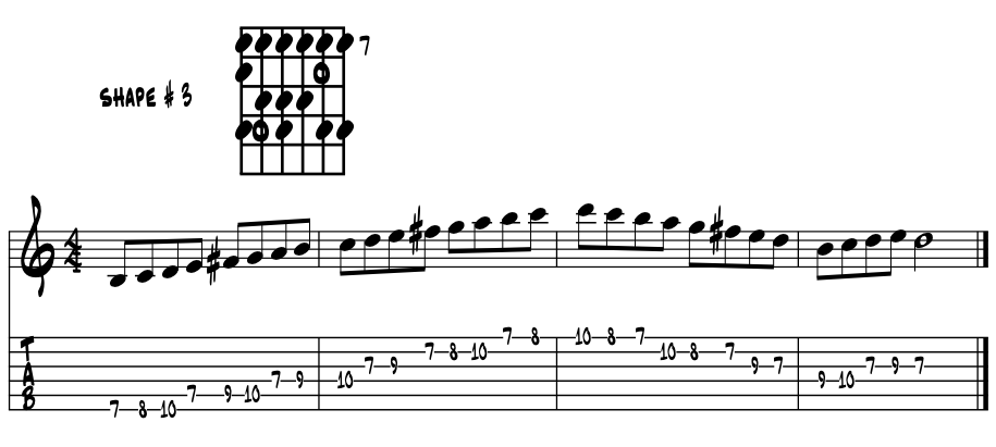 | Shape #3, the 'gospel butter' shape. What? Gospel and butter? Yea, just can't decide which description so glue them right together. For this scale shape is as happening as they get. Starting off on the major third pitch of the G major scale and exhausting everything diatonic in its four fret span. Example 8. |