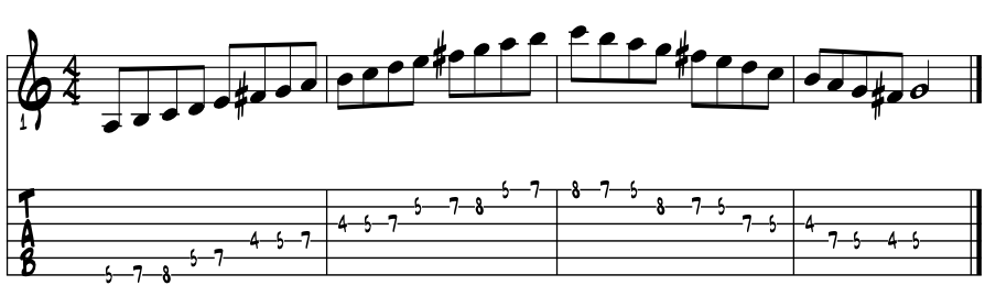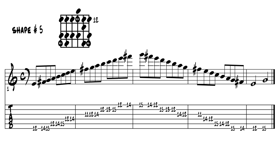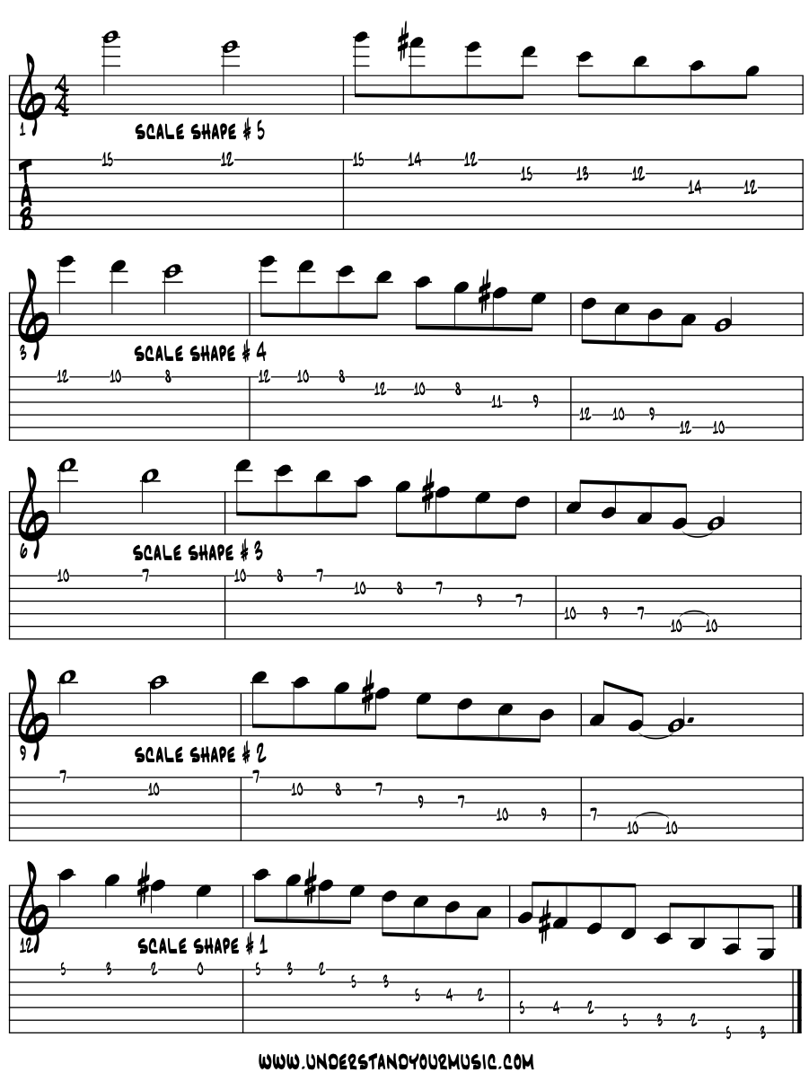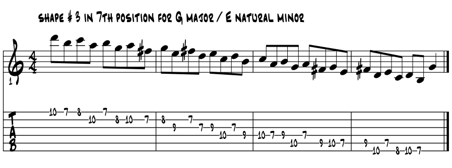 | Shape #5 for G major, the 'blues and butter shape.' Saving the best for last? Pretty much depending. For this last idea is oftentimes the first scale shape many of us first learn when starting to make the magic. Two full octaves, and a clear audio of the relative major / minor pairing. Way up on the high notes, some guitars might be out of frets here, proceed with caution :) Example 10. |