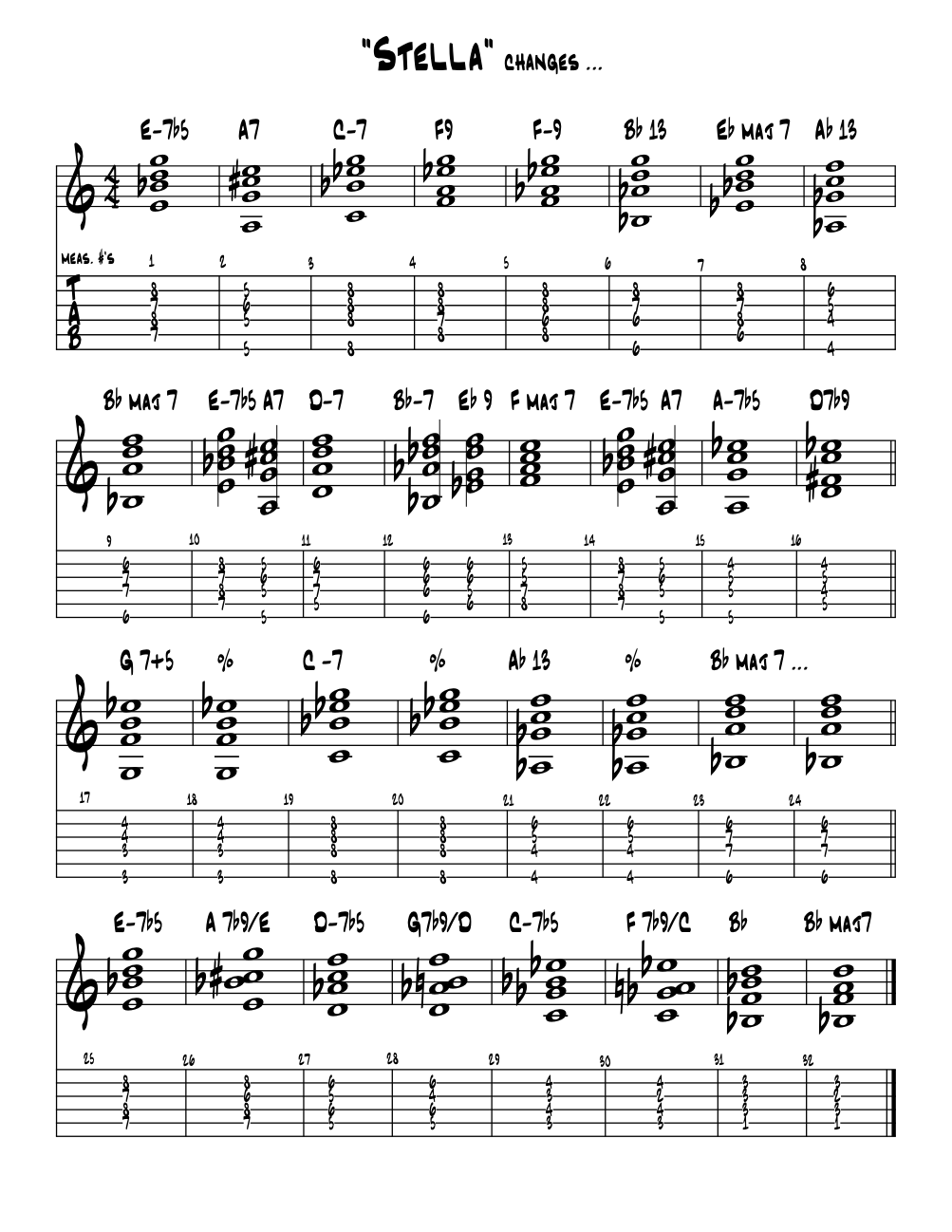 | This song is a jazz guitar players dream come true. For in the modern approach to soloing, our improvised lines get to play through the song's chord changes, 'hear the changes in the line.' "Stella" gives us a lovely nine different pitch melody and whopping harmonic puzzle to interpret and solve anew each time. "Stella" gives us a bass line story and harmonic scheme that is equally a beautiful vocal / poetic story of love combined with complexities rarely found in other songs of this style and genre. Begin to learn it here if need be. Covered by many of the greats, find a fave recording and begin to get its melody under your fingers. In 'Bb', here's a solid root to mostly root motion of the changes, tabbed for guitar. Example 27. |