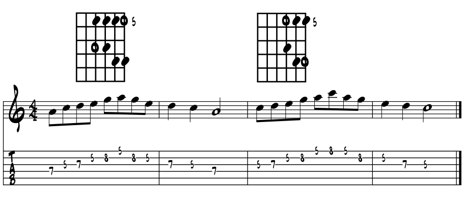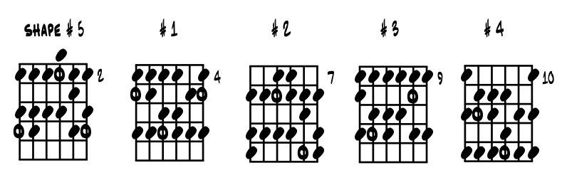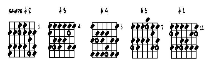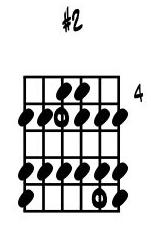 | Two / Five One shapes for scale shape # 1. Let's find the movable Two / Five / One chord shapes within scale pattern #1. Example 6b. |