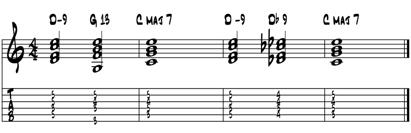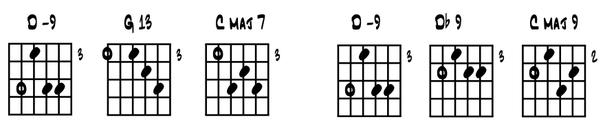 | These three jazz chord shapes are among our most common of our Two / Five One progressions. The Two and One chords give us the alternating 'bossa bass' very easily. The Two chord is the shape that covers the basic bass line pattern for "Take Five", an ostinato pattern to motor things along in the A section of its 32 bar form. The D 13 is used in the blues too and without its root pitch (... think from the root), is one V7 chord type shape to be examined for coolness for your work, and if worthy, thoroughly mastered, for it's a three note scooter with a tritone bite. Here's the evolution of the one Five chord shape into three. Example 9d. |
