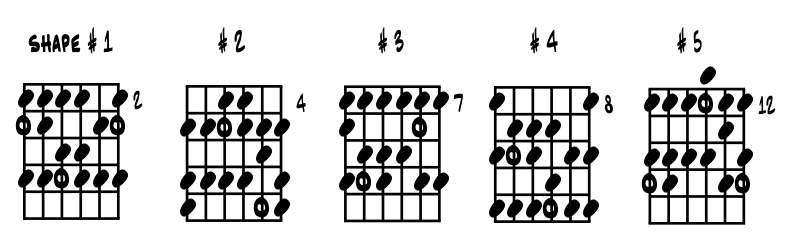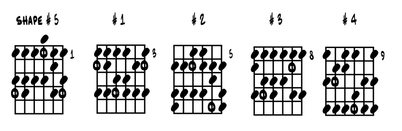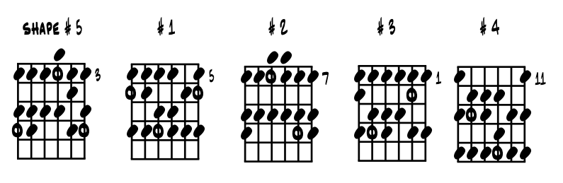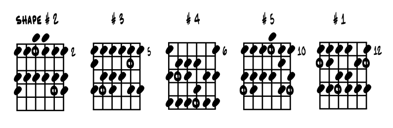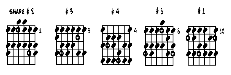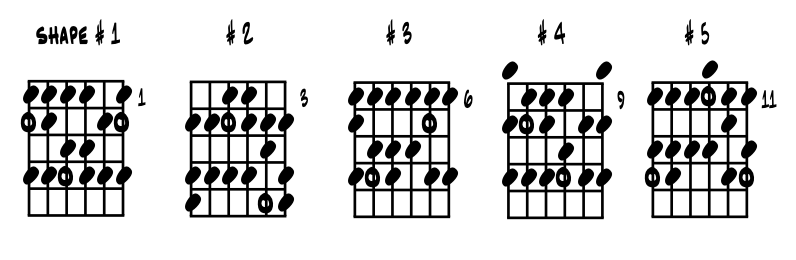 | Jazz guitar; five scale shapes / arpeggios / modes. The Essentials jazz guitar method is based on an interlocking pattern of five unique scale shapes. Each of the shapes is a couple of frets wide so all combined we get a fingerboard roadmap for all of our diatonic key centers, the 12 relative major and minors, all their modes, the intervals, arpeggio and chord shapes generated by the pitches in each position. The blues elevator is in these shapes of course, as is the expansion of the first pentatonic box scale to include four more, so 5 total. Surely there can be more, and you will discover your own faves, but these five will feed the jazz bulldog daily. So the five scale shapes which follow should be committed to long term, rote memory with lots of muscle memory thrown in for good measure. For once established, we'll shed into another couple of layers of coolness to these scale shapes to complete this intro to jazz guitar studies and training. |