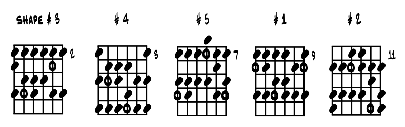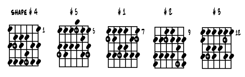 | In these five shapes are contained the diatonic pitches of our most common scales, modes, intervals, arpeggios, chords and color tones. In jazz guitar, near every shape we learn is a movable one; scales, arpeggios and chords, and this is a big help getting through the popular keys and eventually to all 12 of our diatonic key centers. |