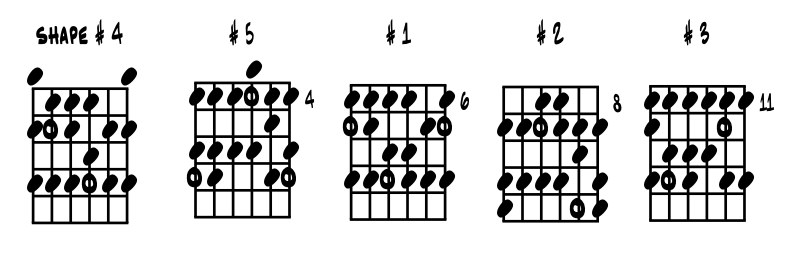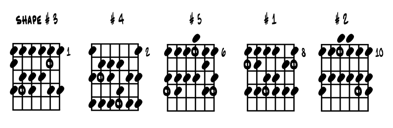 | So ... if we had a sixth shape / sequencing 5 shapes. Well, since we're past the octave 'double dot', it just turns out that we're back to our starting point, but now up one full octave; so our scale shape #1 would be next in our puzzle of these five scale shapes. After one then two, then three to four etc. They're a loop of five shapes that span the guitar's lower octave and puzzle together like this in the relative keys of 'G' major and 'E' natural minor. In this next idea we use the starting bass pitch of each shape to ascend the frets. Example 11. |