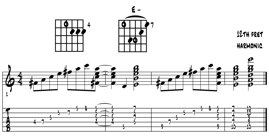 | In true "Lavenian" fashion. A lesson with Lavene would sort of go like this; 'what can one chord shape, in this case a dominant 'E9' chord, generate for a 'curious cat.' Here's the results on paper. Example 1e. |