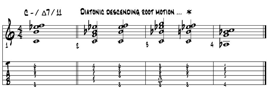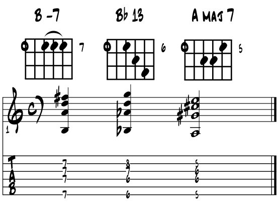 | So from the one voicing we make two more by slight shifts of pitches and moving the pitches down to a lower set of strings. Very common way of finding new coolness. The second and third shapes, especially with a bass player on the gig, are just too handy to not have under the fingers for the evolving modern guitarist. Do learn and master them here if need be. |